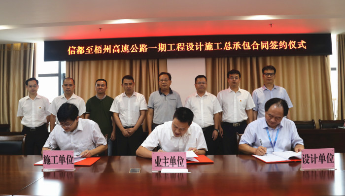 在參會各方共同見證下,項目業主單位、設計單位、施工單位的代表進行了信梧路一期設計施工承包合同的簽約。(羅成斌/文 彭麗潔/圖)